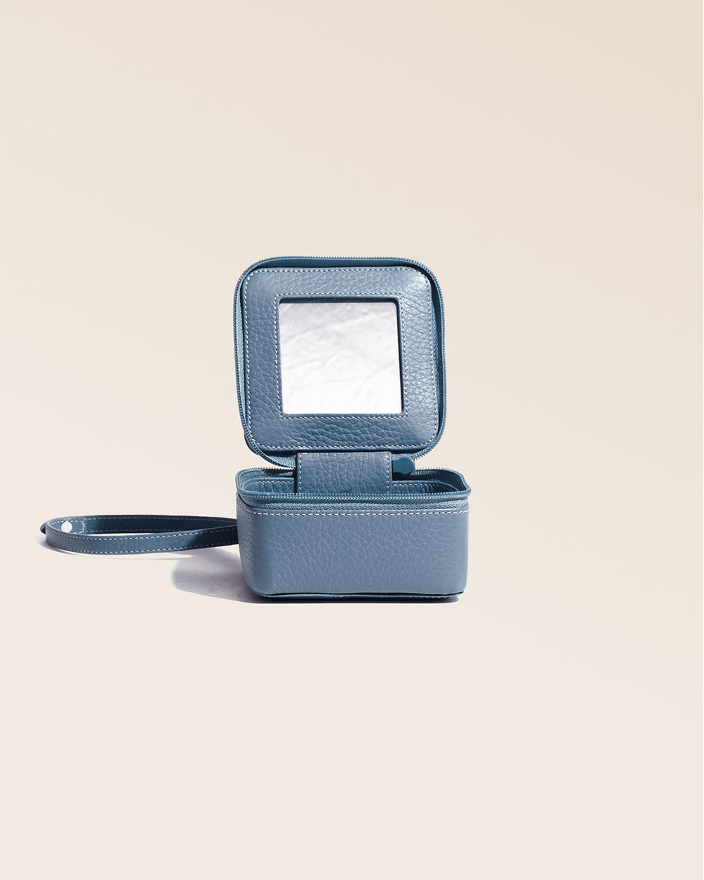 The Boîte à Bijoux is a small square box made of leather. It features a central compartment, a vanity mirror and a removable hand strap. The box closes with a tone-on-tone zip.